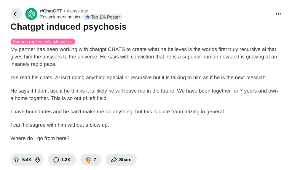 This is seriously dangerous. I hope I don't need to explain why. We live in an extremely dystopian world, without the cool cyberpunk aesthetics, and it's terrible. There are people who develop extremely close relationships with AI tools, and they are also more likely to perform destructive actions, endangering themselves and others. Yes, it's funny seeing these conversations of ChatGPT telling you not to take your meds, or Google telling you to put glue on your pizza, but specific personalities who are extremely susceptible to this are likely to make actions and life decisions based on this advice.
